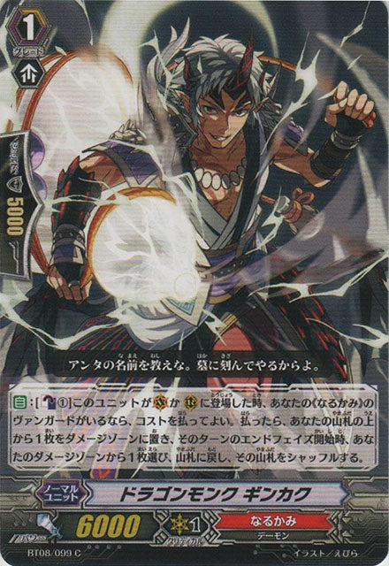 【自】:[【カウンターブラスト】(1)]このユニットが(V)か(R)に登場した時、あなたの《なるかみ》のヴァンガードがいるなら、コストを払ってよい。払ったら、あなたの山札の上から1枚をダメージゾーンに置き、そのターンのエンドフェイズ開始時、あなたのダメージゾーンから1枚選び、山札に戻し、その山札をシャッフルする。