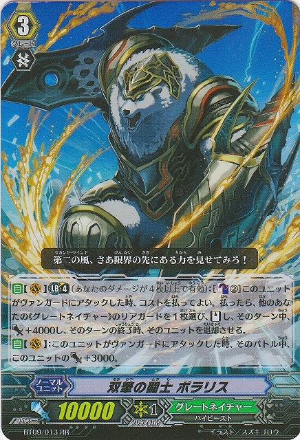 【自】【(V)】【リミットブレイク】(4)(あなたのダメージが4枚以上で有効):[【カウンターブラスト】(2)]このユニットがヴァンガードにアタックした時、コストを払ってよい。払ったら、他のあなたの《グレートネイチャー》のリアガードを1枚選び、【スタンド】し、そのターン中、パワー+4000し、そのターンの終了時、そのユニットを退却させる。【自】【(V)】:このユニットがヴァンガードにアタックした時、そのバトル中、このユニットのパワー+3000。