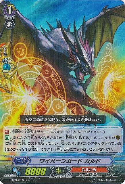 【永】:守護者(守護者はデッキに4枚までしか入れることができない)【自】:[あなたの手札から《なるかみ》を1枚選び、捨てる]このユニットが(G)に登場した時、コストを払ってよい。払ったら、あなたのアタックされている《なるかみ》を1枚選び、そのバトル中、そのユニットは、ヒットされない。