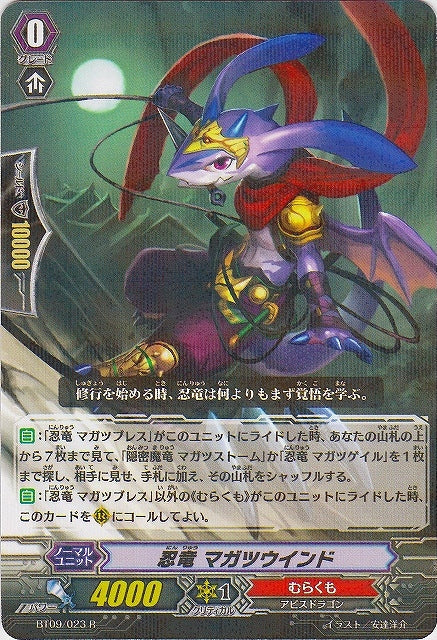 【自】:「忍竜 マガツブレス」がこのユニットにライドした時、あなたの山札の上から7枚まで見て、「隠密魔竜 マガツストーム」か「忍竜 マガツゲイル」を1枚まで探し、相手に見せ、手札に加え、その山札をシャッフルする。【自】:「忍竜 マガツブレス」以外の《むらくも》がこのユニットにライドした時、このカードを(R)にコールしてよい。