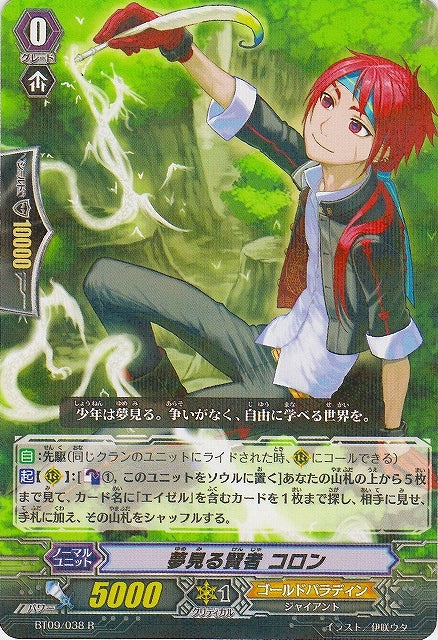 【自】:先駆(同じクランのユニットにライドされた時、(R)にコールできる)【起】【(R)】:[【カウンターブラスト】(1),このユニットをソウルに置く]あなたの山札の上から5枚まで見て、カード名に「エイゼル」を含むカードを1枚まで探し、相手に見せ、手札に加え、その山札をシャッフルする。