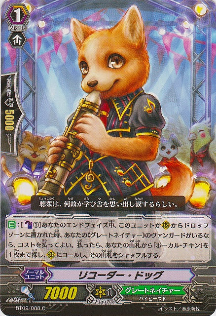 【自】:[【カウンターブラスト】(1)]あなたのエンドフェイズ中、このユニットが(R)からドロップゾーンに置かれた時、あなたの《グレートネイチャー》のヴァンガードがいるなら、コストを払ってよい。払ったら、あなたの山札から「ボーカル・チキン」を1枚まで探し、(R)にコールし、その山札をシャッフルする。
