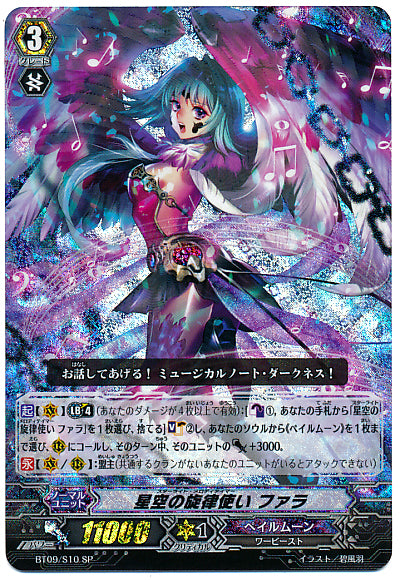 【起】【(V)】【リミットブレイク】(4)(あなたのダメージが4枚以上で有効):[【カウンターブラスト】(1),あなたの手札から「星空の旋律使い ファラ」を1枚選び、捨てる]【ソウルチャージ】(2)し、あなたのソウルから《ペイルムーン》を1枚まで選び、(R)にコールし、そのターン中、そのユニットのパワー+3000。【永】【(V)/(R)】:盟主(共通するクランがないあなたのユニットがいるとアタックできない)
