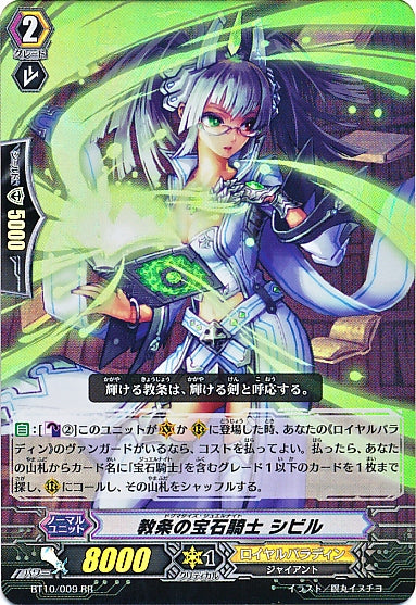 【自】:[【カウンターブラスト】(2)]このユニットが(V)か(R)に登場した時、あなたの《ロイヤルパラディン》のヴァンガードがいるなら、コストを払ってよい。払ったら、あなたの山札からカード名に「宝石騎士」を含むグレード1以下のカードを1枚まで探し、(R)にコールし、その山札をシャッフルする。