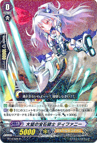 【自】:先駆(同じクランのユニットにライドされた時、(R)にコールできる)【起】【(R)】:[このユニットをソウルに置く]他のあなたのカード名に「宝石騎士」を含むリアガードを2枚まで選び、そのターン中、パワー+3000。