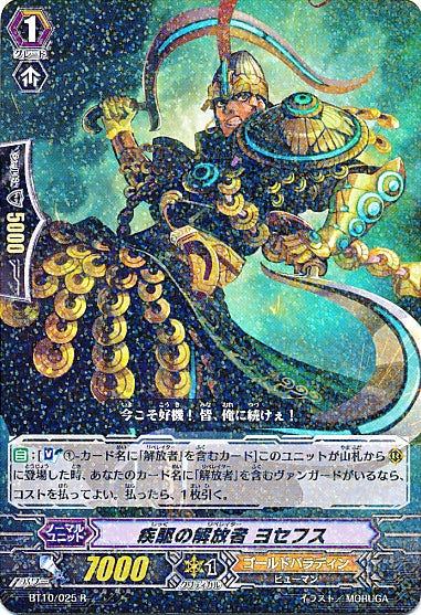 【自】:[【ソウルブラスト】(1)-カード名に「解放者」を含むカード]このユニットが山札から(R)に登場した時、あなたのカード名に「解放者」を含むヴァンガードがいるなら、コストを払ってよい。払ったら、1枚引く。
