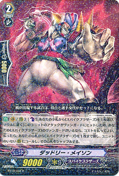 【自】【(V)/(R)】:[【カウンターブラスト】(1),あなたの手札から《スパイクブラザーズ》を1枚選び、ソウルに置く]このユニットのアタックがヴァンガードにヒットした時、あなたの《スパイクブラザーズ》のヴァンガードがいるなら、コストを払ってよい。払ったら、あなたの山札から《スパイクブラザーズ》を1枚まで探し、ユニットのいない(R)にコールし、その山札をシャッフルする。