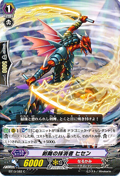 【自】【(R)】:[【ソウルブラスト】(1)]このユニットが「抹消者 ドラゴニック・ディセンダント」を【ブースト】した時、コストを払ってよい。払ったら、そのバトル中、【ブースト】されたユニットのパワー+5000。