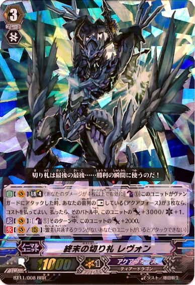 【自】【(V)】【リミットブレイク】(4)(あなたのダメージが4枚以上で有効):[【カウンターブラスト】(1)]このユニットがヴァンガードにアタックした時、あなたの前列の【レスト】している《アクアフォース》が3枚なら、コストを払ってよい。払ったら、そのバトル中、このユニットのパワー+3000/クリティカル+1。【起】【(V)】:[【カウンターブラスト】(1)]そのターン中、このユニットのパワー+2000。【永】【(V)/(R)】:盟主(共通するクランがないあなたのユニットがいるとアタックできない)
