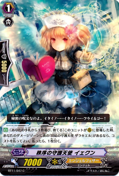 【自】:[あなたの手札から1枚選び、捨てる]このユニットが(R)に登場した時、あなたのダメージゾーンに表の「団結の守護天使 ザラキエル」があるなら、コストを払ってよい。払ったら、1枚引く。