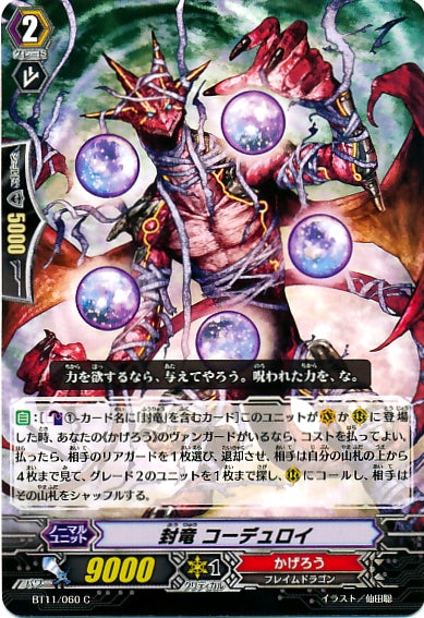 【自】:[【カウンターブラスト】(1)-カード名に「封竜」を含むカード]このユニットが(V)か(R)に登場した時、あなたの《かげろう》のヴァンガードがいるなら、コストを払ってよい。払ったら、相手のリアガードを1枚選び、退却させ、相手は自分の山札の上から4枚まで見て、グレード2のユニットを1枚まで探し、(R)にコールし、相手はその山札をシャッフルする。