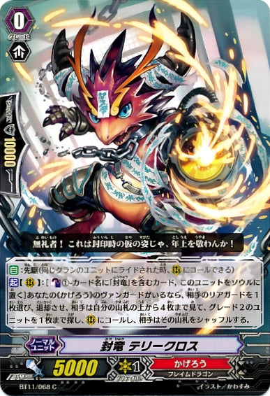【自】:先駆(同じクランのユニットにライドされた時、(R)にコールできる)【起】【(R)】:[【カウンターブラスト】(1)-カード名に「封竜」を含むカード,このユニットをソウルに置く]あなたの《かげろう》のヴァンガードがいるなら、相手のリアガードを1枚選び、退却させ、相手は自分の山札の上から4枚まで見て、グレード2のユニットを1枚まで探し、(R)にコールし、相手はその山札をシャッフルする。