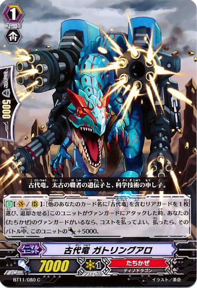【自】【(V)/(R)】:[他のあなたのカード名に「古代竜」を含むリアガードを1枚選び、退却させる]このユニットがヴァンガードにアタックした時、あなたの《たちかぜ》のヴァンガードがいるなら、コストを払ってよい。払ったら、そのバトル中、このユニットのパワー+5000。