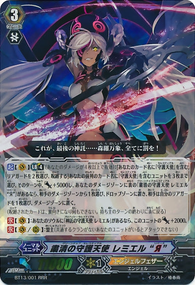 【起】【(V)】【リミットブレイク】(4)(あなたのダメージが4枚以上で有効):[あなたのカード名に「守護天使」を含むリアガードを2枚選び、呪縛する]あなたの前列のカード名に「守護天使」を含むユニットを3枚まで選び、そのターン中、パワー+5000し、あなたのダメージゾーンに表の「粛清の守護天使 レミエル “Я(リバース)”」があるなら、相手のダメージゾーンから1枚選び、ドロップゾーンに置き、相手は自分のリアガードを1枚選び、ダメージゾーンに置く。(呪縛されたカードは、裏向きになり何もできない。持ち主のターンの終わりに表に戻る)【永】【(V)】:あなたのソウルに「神託の守護天使 レミエル」があるなら、このユニットのパワー+2000。【永】【(V)/(R)】:盟主(共通するクランがないあなたのユニットがいるとアタックできない)