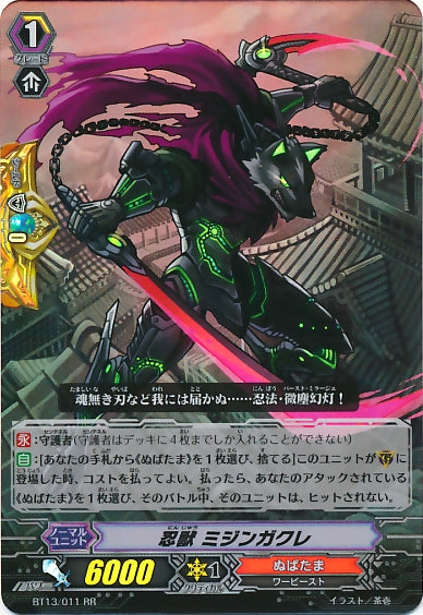 【永】:守護者(守護者はデッキに4枚までしか入れることができない)【自】:[あなたの手札から《ぬばたま》を1枚選び、捨てる]このユニットが(G)に登場した時、コストを払ってよい。払ったら、あなたのアタックされている《ぬばたま》を1枚選び、そのバトル中、そのユニットは、ヒットされない。