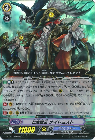 【自】【リミットブレイク】(4)(あなたのダメージが4枚以上で有効):《グランブルー》がこのユニットにライドした時、あなたのヴァンガードを1枚選び、そのターン中、パワー+10000し、あなたのドロップゾーンから《グランブルー》を2枚まで選び、(R)にコールし、そのターン中、この効果でコールされたユニットのパワー+5000し、そのターンの終了時、そのユニットを退却させる。【永】【(V)】:あなたのターン中、あなたの《グランブルー》のリアガードが4枚以上なら、このユニットのパワー+2000。【永】【(V)/(R)】:盟主(共通するクランがないあなたのユニットがいるとアタックできない)