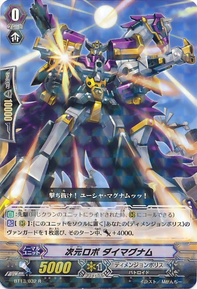 【自】:先駆(同じクランのユニットにライドされた時、(R)にコールできる)【起】【(R)】:[このユニットをソウルに置く]あなたの《ディメンジョンポリス》のヴァンガードを1枚選び、そのターン中、パワー+4000。