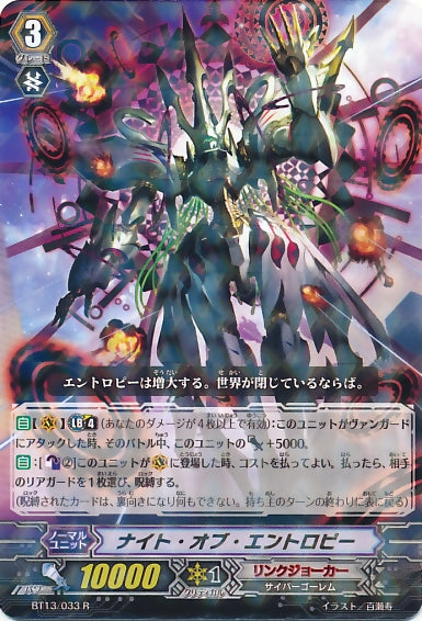 【自】【(V)】【リミットブレイク】(4)(あなたのダメージが4枚以上で有効):このユニットがヴァンガードにアタックした時、そのバトル中、このユニットのパワー+5000。【自】:[【カウンターブラスト】(2)]このユニットが(V)に登場した時、コストを払ってよい。払ったら、相手のリアガードを1枚選び、呪縛する。(呪縛されたカードは、裏向きになり何もできない。持ち主のターンの終わりに表に戻る)