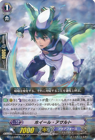【自】【(R)】:[【カウンターブラスト】(1)]このユニットが【ブースト】したバトルの終了時、あなたの《アクアフォース》のヴァンガードがいるなら、コストを払ってよい。払ったら、あなたの《アクアフォース》のリアガードを2枚選び、位置を交換する。(カードの向きは変わらない。)