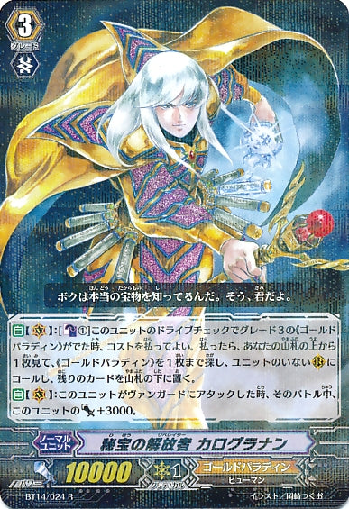 【自】【(V)】:[【カウンターブラスト】(1)]このユニットのドライブチェックでグレード3の《ゴールドパラディン》がでた時、コストを払ってよい。払ったら、あなたの山札の上から1枚見て、《ゴールドパラディン》を1枚まで探し、ユニットのいない(R)にコールし、残りのカードを山札の下に置く。【自】【(V)】:このユニットがヴァンガードにアタックした時、そのバトル中、このユニットのパワー+3000。