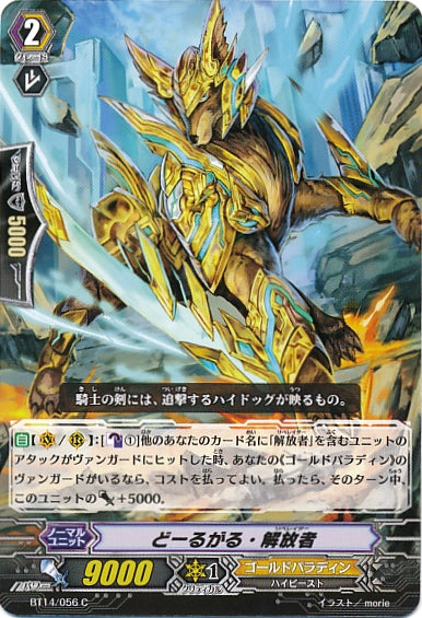 【自】【(V)/(R)】:[【カウンターブラスト】(1)]他のあなたのカード名に「解放者」を含むユニットのアタックがヴァンガードにヒットした時、あなたの《ゴールドパラディン》のヴァンガードがいるなら、コストを払ってよい。払ったら、そのターン中、このユニットのパワー+5000。