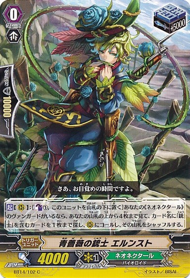 【起】【(R)】:[【カウンターブラスト】(1),このユニットを山札の下に置く]あなたの《ネオネクタール》のヴァンガードがいるなら、あなたの山札の上から4枚まで見て、カード名に「銃士」を含むカードを1枚まで探し、(R)にコールし、その山札をシャッフルする。