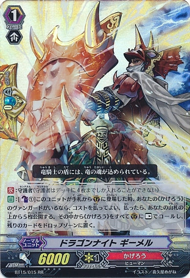 【永】:守護者(守護者はデッキに4枚までしか入れることができない)【自】:[【カウンターブラスト】(1)]このユニットが手札から(G)に登場した時、あなたの《かげろう》のヴァンガードがいるなら、コストを払ってよい。払ったら、あなたの山札の上から5枚公開する。その中から《かげろう》をすべて(G)に【レスト】でコールし、残りのカードをドロップゾーンに置く。