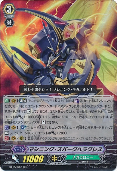 【自】【(V)】【リミットブレイク】(4)(あなたのダメージが4枚以上で有効):[【カウンターブラスト】(2)-カード名に「マシニング」を含むカード]このユニットがヴァンガードにアタックした時、相手の、ヴァンガードとリアガードがすべて【レスト】しているなら、コストを払ってよい。払ったら、そのバトル中、このユニットのパワー+10000/クリティカル+1し、相手のリアガードを1枚選び、そのユニットは、次の相手のスタンドフェイズ中、【スタンド】できない。【起】【(V)】:[【ソウルブラスト】(1)-カード名に「マシニング」を含むカード]相手のリアガードをすべて【レスト】し、そのターン中、このユニットのパワー+2000。【永】【(V)/(R)】:盟主(共通するクランがないあなたのユニットがいるとアタックできない)