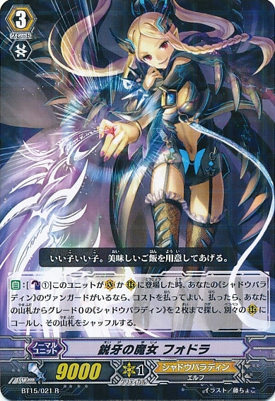 【自】:[【カウンターブラスト】(1)]このユニットが(V)か(R)に登場した時、あなたの《シャドウパラディン》のヴァンガードがいるなら、コストを払ってよい。払ったら、あなたの山札からグレード0の《シャドウパラディン》を2枚まで探し、別々の(R)にコールし、その山札をシャッフルする。