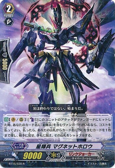 【自】【(V)/(R)】:[【カウンターブラスト】(1)]このユニットのアタックがヴァンガードにヒットした時、あなたのカード名に「星輝兵」を含むヴァンガードがいるなら、コストを払ってよい。払ったら、あなたの山札からカード名に「Я」を含むカードを1枚まで探し、相手に見せ、手札に加え、その山札をシャッフルする。