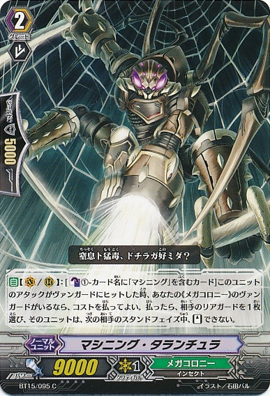 【自】【(V)/(R)】:[【カウンターブラスト】(1)-カード名に「マシニング」を含むカード]このユニットのアタックがヴァンガードにヒットした時、あなたの《メガコロニー》のヴァンガードがいるなら、コストを払ってよい。払ったら、相手のリアガードを1枚選び、そのユニットは、次の相手のスタンドフェイズ中、【スタンド】できない。