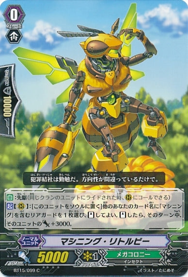 【自】:先駆(同じクランのユニットにライドされた時、(R)にコールできる)【起】【(R)】:[このユニットをソウルに置く]他のあなたのカード名に「マシニング」を含むリアガードを1枚選び、【スタンド】してよい。【スタンド】したら、そのターン中、そのユニットのパワー+3000。