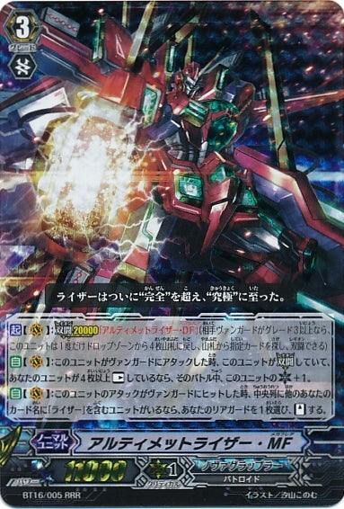 【起】【(V)】:【双闘20000】「アルティメットライザー・DF」(相手ヴァンガードがグレード3以上なら、このユニットは1度だけドロップゾーンから4枚山札に戻し、山札から指定カードを探し、双闘できる)【自】【(V)】:このユニットがヴァンガードにアタックした時、このユニットが【双闘】していて、あなたのユニットが4枚以上【レスト】しているなら、そのバトル中、このユニットのクリティカル+1。【自】【(V)】:このユニットのアタックがヴァンガードにヒットした時、中央列に他のあなたのカード名に「ライザー」を含むユニットがいるなら、あなたのリアガードを1枚選び、【スタンド】する。