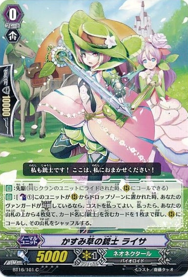 【自】:先駆(同じクランのユニットにライドされた時、(R)にコールできる)【自】:[【カウンターブラスト】(1)]このユニットが(R)からドロップゾーンに置かれた時、あなたのヴァンガードが【双闘】しているなら、コストを払ってよい。払ったら、あなたの山札の上から4枚見て、カード名に「銃士」を含むカードを1枚まで探し、(R)にコールし、その山札をシャッフルする。
