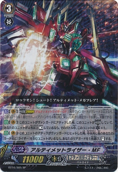 【起】【(V)】:【双闘20000】「アルティメットライザー・DF」(相手ヴァンガードがグレード3以上なら、このユニットは1度だけドロップゾーンから4枚山札に戻し、山札から指定カードを探し、双闘できる)【自】【(V)】:このユニットがヴァンガードにアタックした時、このユニットが【双闘】していて、あなたのユニットが4枚以上【レスト】しているなら、そのバトル中、このユニットのクリティカル+1。【自】【(V)】:このユニットのアタックがヴァンガードにヒットした時、中央列に他のあなたのカード名に「ライザー」を含むユニットがいるなら、あなたのリアガードを1枚選び、【スタンド】する。