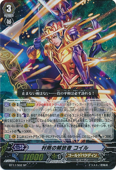 【起】【(V)】:【双闘20000】「夕立の解放者 トラヘルン」(相手ヴァンガードがグレード3以上なら、このユニットは1度だけドロップゾーンから4枚山札に戻し、山札から指定カードを探し、双闘できる)【起】【(V)】:[【カウンターブラスト】(2),あなたの手札からあなたの(V)にいるユニットと同名のカードを1枚選び、捨てる]このユニットが【双闘】しているなら、あなたの山札の上から4枚見て、2枚まで探し、ユニットのいない別々の(R)にコールし、残りのカードを山札の下に好きな順番で置き、そのターン中、そのユニットのパワー+5000。【自】【(V)】:このユニットがヴァンガードにアタックした時、そのバトル中、このユニットのパワー+2000。
