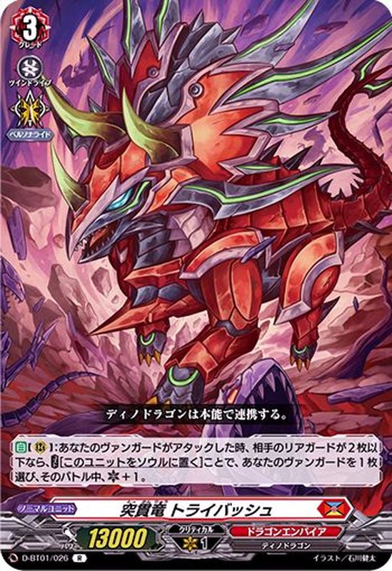 【自】【(R)】:あなたのヴァンガードがアタックした時、相手のリアガードが2枚以下なら、【コスト】[このユニットをソウルに置く]ことで、あなたのヴァンガードを1枚選び、そのバトル中、クリティカル+1。