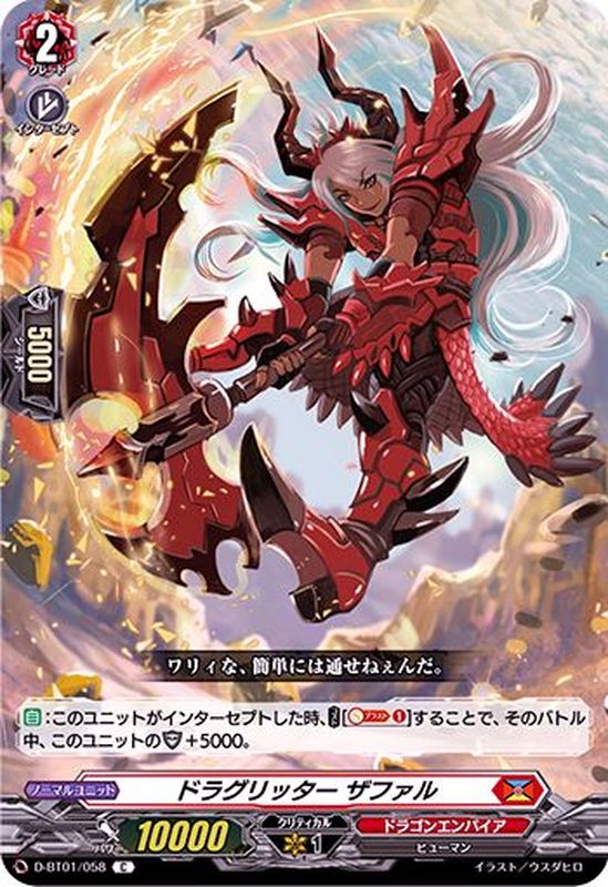 【自】:このユニットがインターセプトした時、【コスト】[【ソウルブラスト】(1)]することで、そのバトル中、このユニットのシールド+5000。