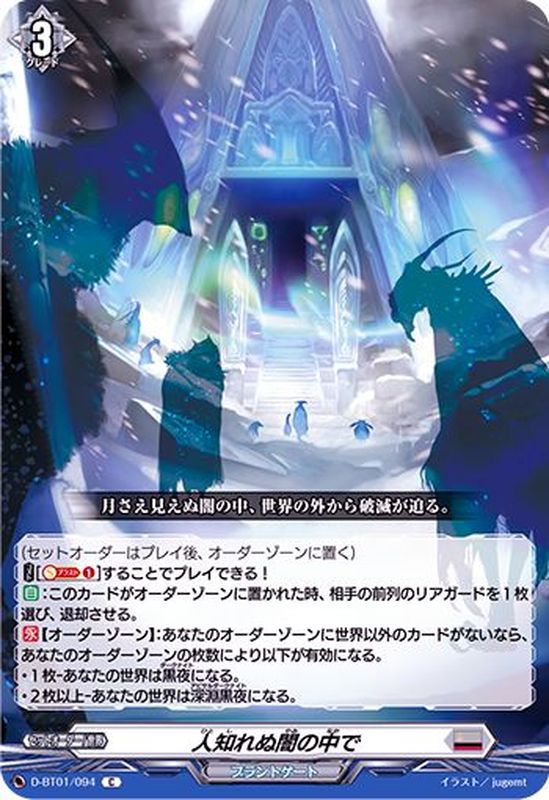(セットオーダーはプレイ後、オーダーゾーンに置く)【コスト】[【ソウルブラスト】(1)]することでプレイできる!【自】:このカードがオーダーゾーンに置かれた時、相手の前列のリアガードを1枚選び、退却させる。【永】【オーダーゾーン】:あなたのオーダーゾーンに世界以外のカードがないなら、あなたのオーダーゾーンの枚数により以下が有効になる。・1枚-あなたの世界は黒夜になる。・2枚以上-あなたの世界は深淵黒夜になる。