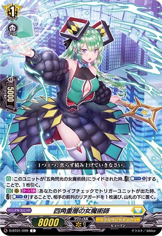 【自】:このユニットが「五角閃光の女魔術師」にライドされた時、【コスト】[【カウンターブラスト】(1)]することで、1枚引く。【自】【(R)】【ターン1回】:あなたのドライブチェックでトリガーユニットが出た時、【コスト】[【カウンターブラスト】(1)]することで、相手の前列のリアガードを1枚選び、山札の下に置く。