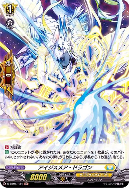【永】:守護者【自】:このユニットが(G)に置かれた時、あなたのユニットを1枚選び、そのバトル中、ヒットされない。あなたの手札が2枚以上なら、手札から1枚選び、捨てる。