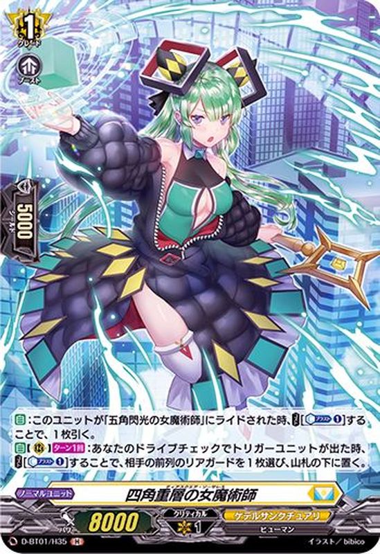 【自】:このユニットが「五角閃光の女魔術師」にライドされた時、【コスト】[【カウンターブラスト】(1)]することで、1枚引く。【自】【(R)】【ターン1回】:あなたのドライブチェックでトリガーユニットが出た時、【コスト】[【カウンターブラスト】(1)]することで、相手の前列のリアガードを1枚選び、山札の下に置く。