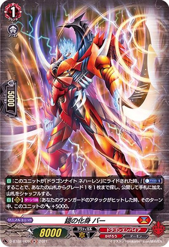 【自】:このユニットが「ドラゴンナイト ネハーレン」にライドされた時、【コスト】[【カウンターブラスト】(1)]することで、あなたの山札からグレード1を1枚まで探し、公開して手札に加え、山札をシャッフルする。【自】【(R)】【ターン1回】:あなたのヴァンガードのアタックがヒットした時、そのターン中、このユニットのパワー+5000。