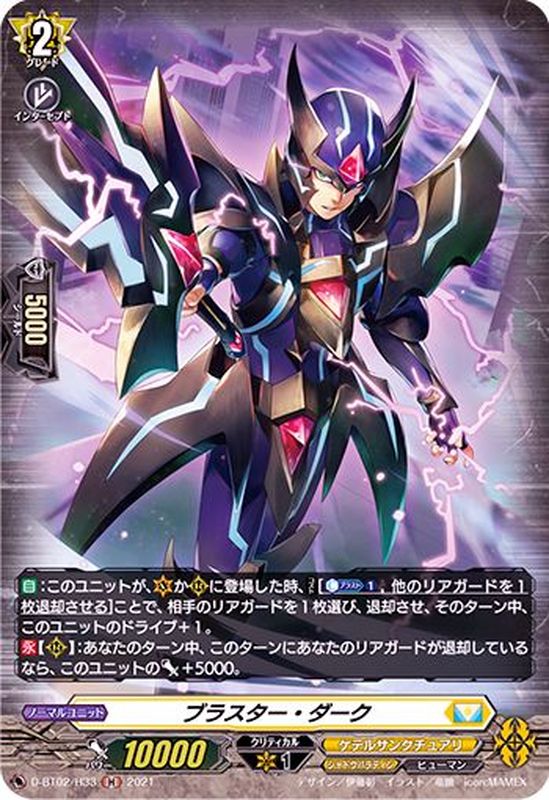 【自】:このユニットが、(V)か(R)に登場した時、【コスト】[【カウンターブラスト】(1),他のリアガードを1枚退却させる]ことで、相手のリアガードを1枚選び、退却させ、そのターン中、このユニットのドライブ+1。【永】【(R)】:あなたのターン中、このターンにあなたのリアガードが退却しているなら、このユニットのパワー+5000。