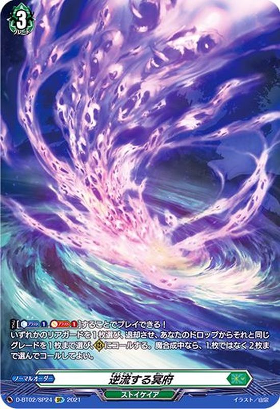 【コスト】[【カウンターブラスト】(1),【ソウルブラスト】(1)]することでプレイできる!いずれかのリアガードを1枚選び、退却させ、あなたのドロップからそれと同じグレードを1枚まで選び、(R)にコールする。魔合成中なら、1枚ではなく2枚まで選んでコールしてよい。