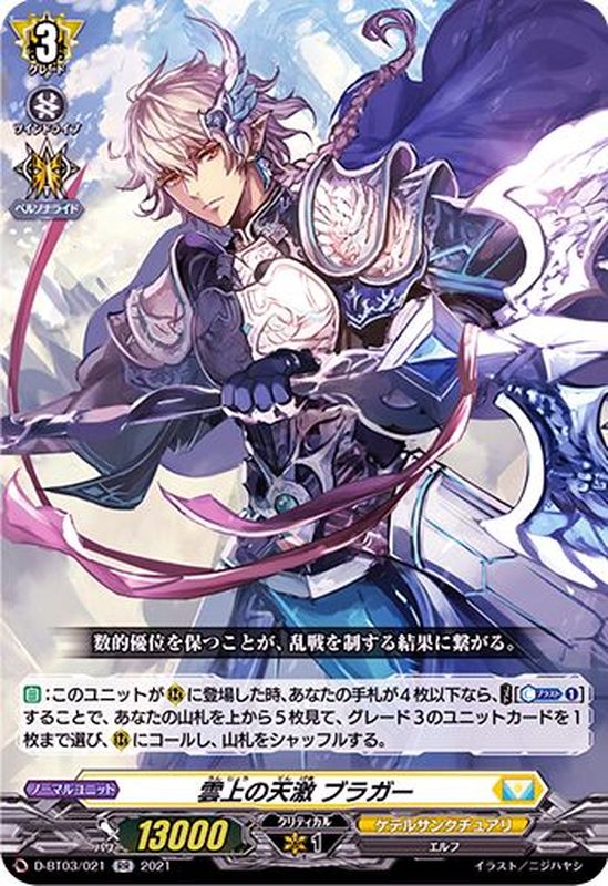【自】:このユニットが(R)に登場した時、あなたの手札が4枚以下なら、【コスト】[【カウンターブラスト】(1)]することで、あなたの山札を上から5枚見て、グレード3のユニットカードを1枚まで選び、(R)にコールし、山札をシャッフルする。
