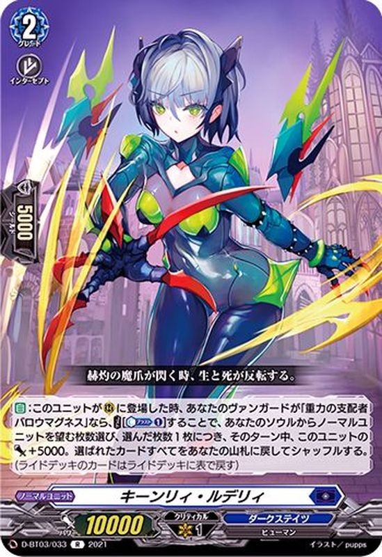 【自】:このユニットが(R)に登場した時、あなたのヴァンガードが「重力の支配者 バロウマグネス」なら、【コスト】[【カウンターブラスト】(1)]することで、あなたのソウルからノーマルユニットを望む枚数選び、選んだ枚数1枚につき、そのターン中、このユニットのパワー+5000。選ばれたカードすべてをあなたの山札に戻してシャッフルする。(ライドデッキのカードはライドデッキに表で戻す)