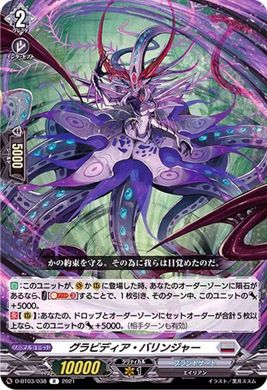 【自】:このユニットが、(V)か(R)に登場した時、あなたのオーダーゾーンに隕石があるなら、【コスト】[【ソウルブラスト】(3)]することで、1枚引き、そのターン中、このユニットのパワー+5000。【永】【(R)】:あなたの、ドロップとオーダーゾーンにセットオーダーが合計5枚以上なら、このユニットのパワー+5000。(相手ターンも有効)