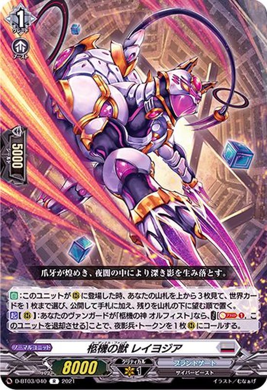 【自】:このユニットが(R)に登場した時、あなたの山札を上から3枚見て、世界カードを1枚まで選び、公開して手札に加え、残りを山札の下に望む順で置く。【起】【(R)】:あなたのヴァンガードが「柩機の神 オルフィスト」なら、【コスト】[【ソウルブラスト】(1),このユニットを退却させる]ことで、夜影兵・トークンを1枚(R)にコールする。