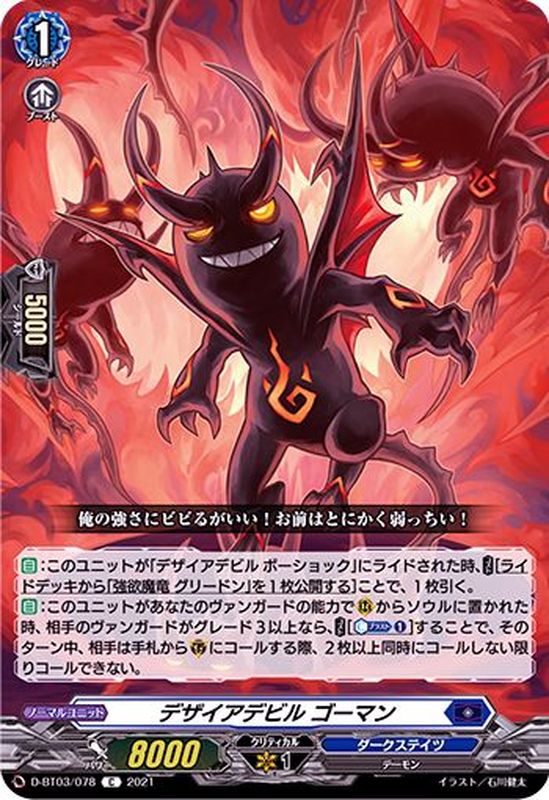 【自】:このユニットが「デザイアデビル ボーショック」にライドされた時、【コスト】[ライドデッキから「強欲魔竜 グリードン」を1枚公開する]ことで、1枚引く。【自】:このユニットがあなたのヴァンガードの能力で(R)からソウルに置かれた時、相手のヴァンガードがグレード3以上なら、【コスト】[【カウンターブラスト】(1)]することで、そのターン中、相手は手札から(G)にコールする際、2枚以上同時にコールしない限りコールできない。